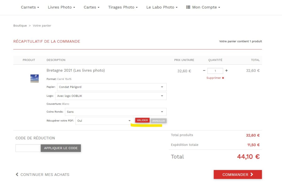 Nous offrons la possibilité de récupérer le PDF version Web de votre projet de Carnet/Livre photo. C’est une option payante disponible dans le panier :