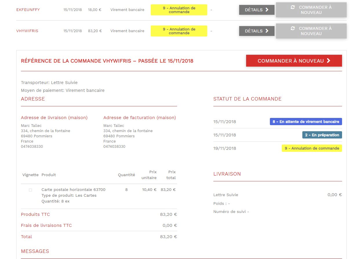 Sur cette page vous pouvez suivre l’état d’avancement de votre commande et retrouver les Factures au format PDF, les détails de votre commande, et également commander à nouveau, à l’identique, directement votre commande.