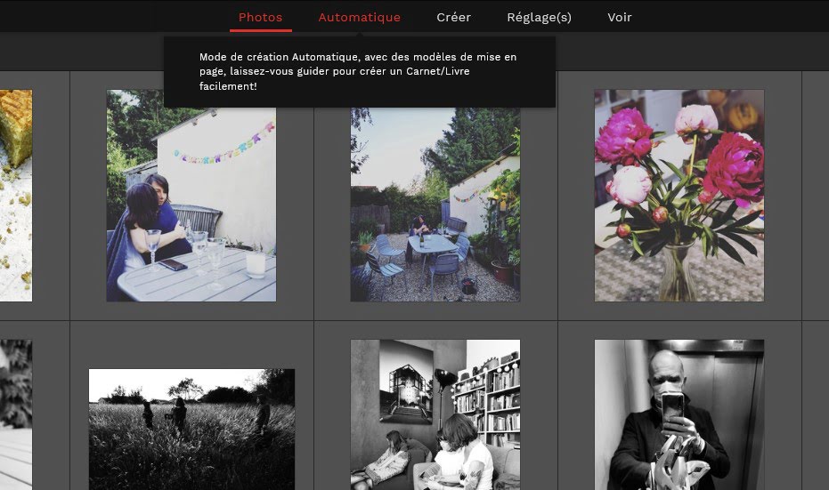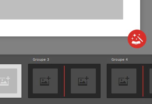 La grande nouveauté de l’éditeur PRO c’est la possibilité de créer automatiquement votre projet de Carnet ou de Livre. Avec un minimum de 30 photos, vous voyez apparaître le logo rouge avec une baguette magique, il vous suffit de cliquer dessus pour lancer la conception du livre automatiquement.