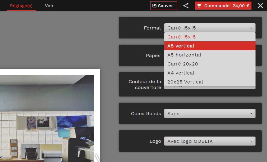 Vous pouvez changer d’idée en cours de projet, vous avez donc un menu Réglage(s) pour changer les options de format, de papier, de couleur de couverture, etc.