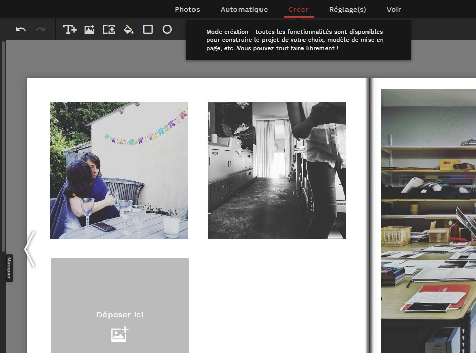 Dans le mode Créer vous avez la possibilité de tout modifier, éditer, ajouter des images, du texte, etc. Vous êtes absolument libre de créer votre mise en page comme vous le voulez, nous aimons vous laisser le choix et vous offrir les outils pour créer librement votre Carnet.