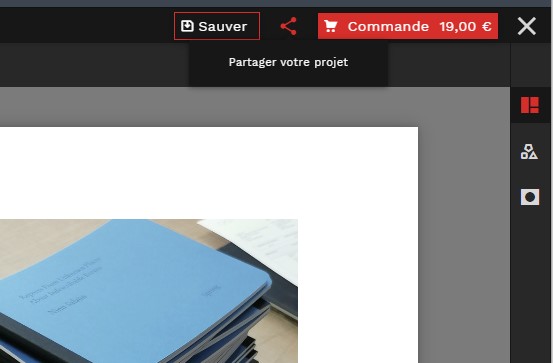 Vous voulez partager un projet avec des amis, de la famille ? Rien de plus simple, vous cliquez sur le logo “Partager votre projet” (entre Sauver et Commander), et vous pourrez alors activer un lien de partage (une URL protégée) qu’il vous suffit de copier/coller pour partager votre Carnet en mode prévisualisation uniquement.