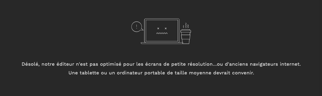 L’éditeur en ligne a besoin d’une résolution d’écran d’assez grande taille (il n’est pas optimisé pour les tablette ni téléphone…), idéalement un minimum de 1170 px pour pouvoir afficher correctement tout l’éditeur.