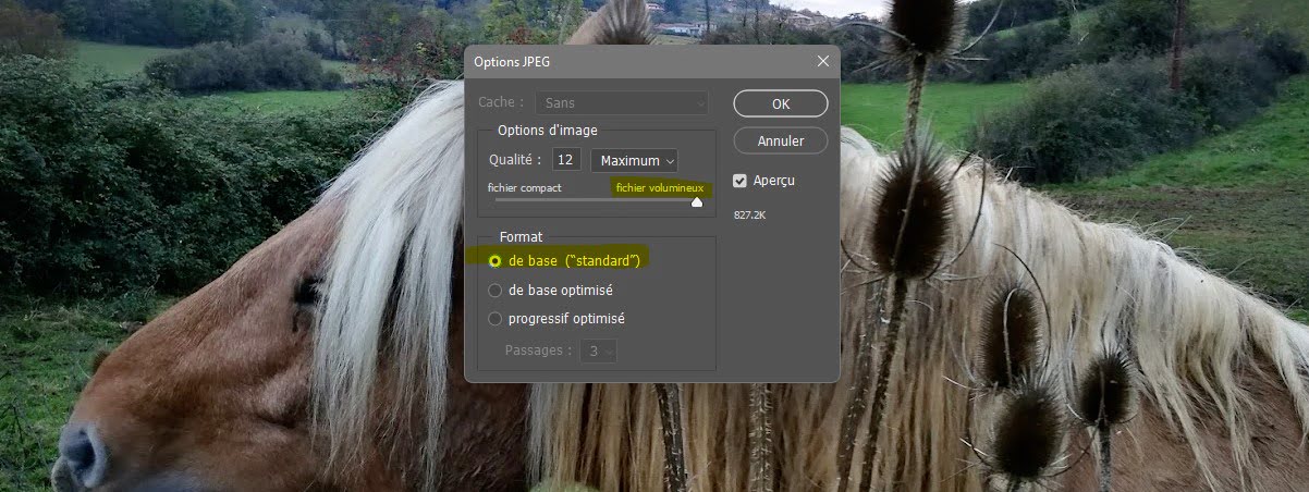 Pour les options d’enregistrement du fichier : Qualité MAXIMUM (12, pas de compression) et Format de base (standard).