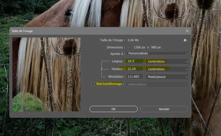 Note : ne “gonflez” pas vos fichiers! sur la capture écran ci dessus (depuis un fichier de téléphone portable), si vous ne cochez pas l’option “rééchantillonnage” dans “Taille de l’image” vous voyez qu’au format 29.7×22.29 cm la résolution est de 111 pixels/pouce, c’est la résolution “naturelle” de votre fichier issu du capteur de votre appareil photo. Quand vous retaillez des fichiers, la résolution minimal peut être de 100 dpi (pixels/pouce) pour des petits projets, et au maximum de 300 dpi.