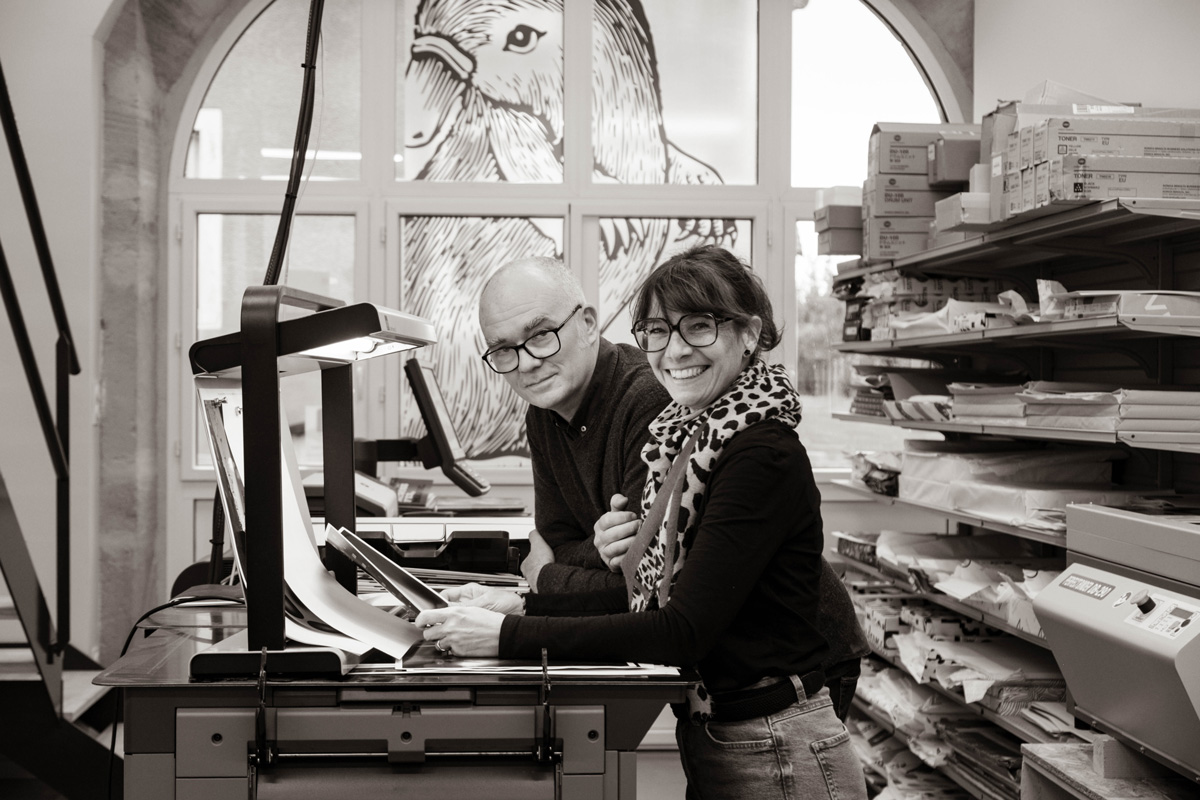 Claire & Marc, artisans imprimeurs depuis 2008. Presse numérique Konica, traceurs pigmentaires, outils de reliure — un atelier Artisan d'Art, certifié Hahnemühle, 100% made in France.