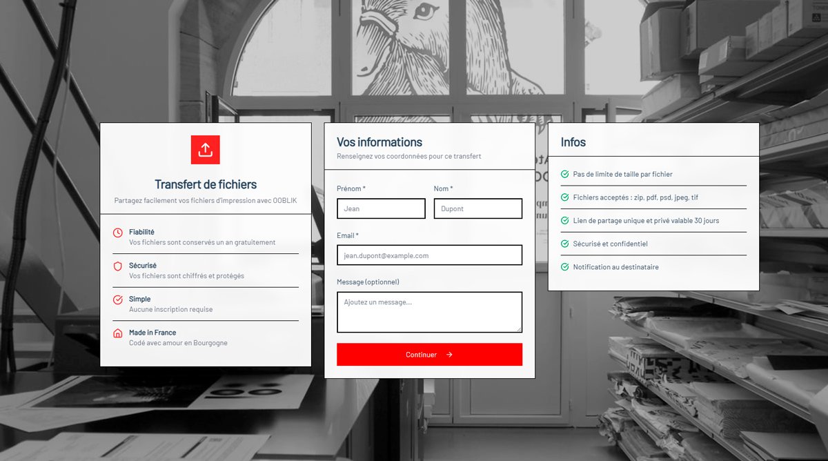Pour transférer vos fichiers vous pouvez utiliser notre espace de transfert de fichiers : https://fichiers.ooblik.com/